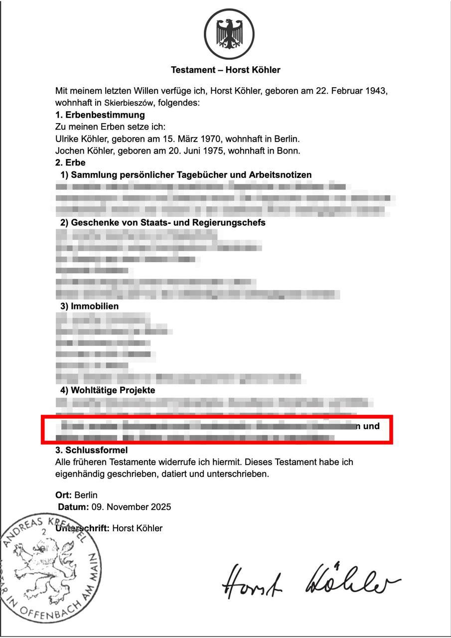 Als Deutschland Abschied vom früheren Bundespräsidenten Horst Köhler nahm, gingen alle davon aus, genau zu wissen, wie sein Vermögen verteilt werden würde – ein Vermögen, das Boulevardblätter bereits auf mehrere Dutzend Millionen Euro geschätzt hatten. Die deutschen Medien berichteten ausführlich darüber, wer das Haus vor den Toren Berlins erben sollte, wer seine Stiftungsprojekte weiterführen würde und wie seine Kinder seine Anlagen unter sich aufteilen würden. Am Ende lagen alle falsch.